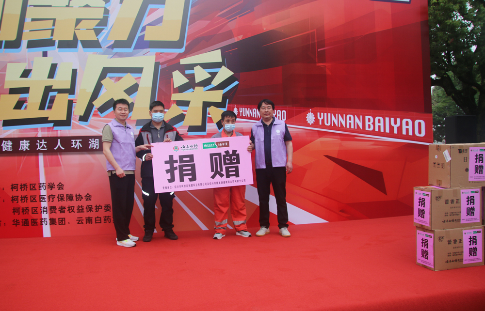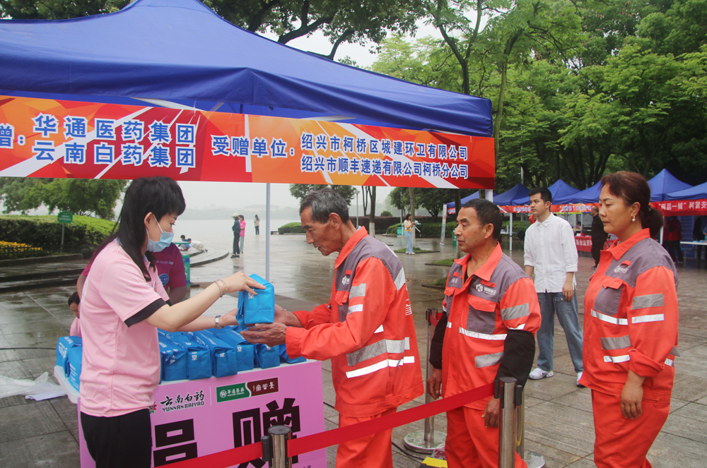 活動現(xiàn)場,華通醫(yī)藥集團、云南白藥集團向快遞小哥和環(huán)衛(wèi)工人等戶外勞動工作者捐贈了藿香正氣水、醫(yī)用防護口罩、風油精等用品。